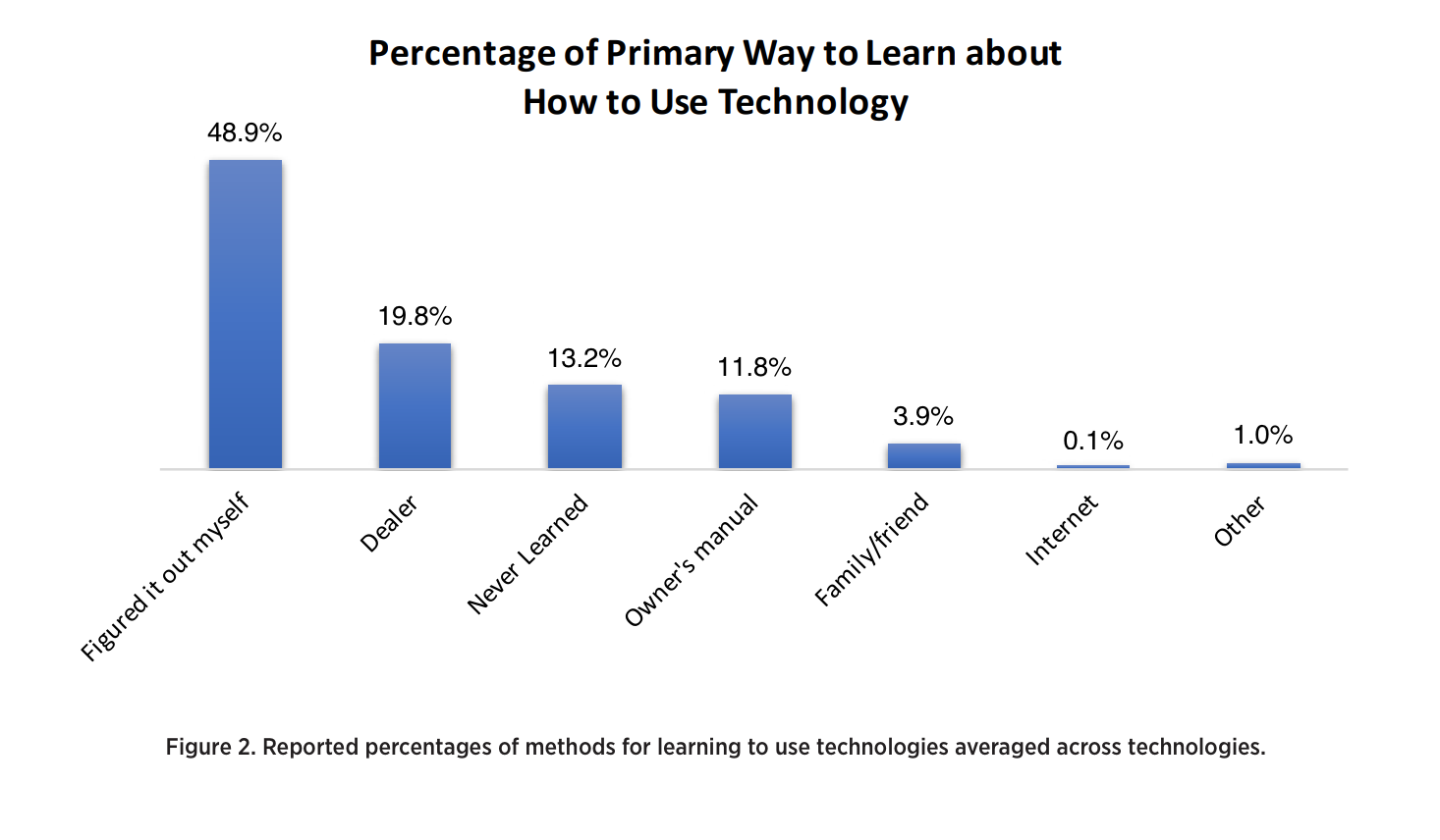 As seen in Figure 2, almost half (48.9%) of the respondents said they learned to use these technologies on their own, while 19.8% said they learned from the automotive dealer. About 13% said they never learned to use the technologies. Answers varied by system. The question was asked for 12 of the 15 technologies, but not for adaptive headlights, emergency response and in-vehicle concierge.