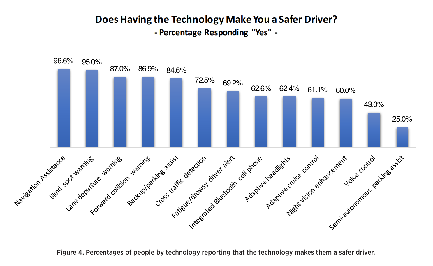As seen in Figure 4, the percentage of people indicating that the technologies in their vehicle made them safer drivers varied widely by the type of system. More than 96% of respondents said they think navigation assistance makes them a safer driver, while only 25% reported thinking semi-automated parking assist did so. Bluetooth cell phone safety perceptions varied between groups, with fewer females reporting that the technology made them a safer driver compared with males. In addition, safety perceptions decreased for Bluetooth cell phone use as age increased. Reported feelings of safety associated with voice control varied by income; middle-income drivers were less likely to think that technology made them a safer driver when compared with both lower- and higher-income drivers. With adaptive cruise control, blind spot warning and navigation assistance, more highly educated respondents were more likely to report the technology contributing to safety.