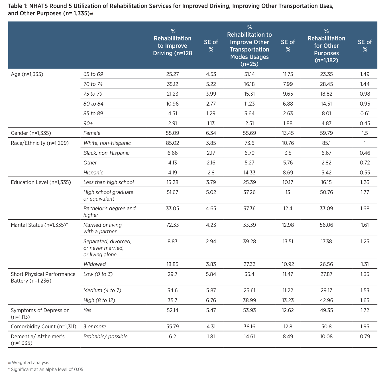 This study used data from the National Health and Aging Trends Study (NHATS; www.nhats.org), a longitudinal cohort study that gathers information on a nationally representative sample of Medicare beneficiaries aged 65 and older across the country. NHATS currently consists of five rounds of data, starting in 2011 (round 1) to 2015 (round 5). Round 5 is the first round to address specifically the utilization of rehabilitation services among the sampled population. This study describes characteristics of older adults living in the community (i.e., not in a nursing home) who received rehabilitation services in the past year to improve driving or to improve the use of other forms of transportation or for other purposes besides transportation. Rehabilitation includes services such as physical therapy, occupational therapy, or speech therapy for various purposes. Information collected for this study also included demographic information, health status and physical function. Demographic information includes gender, age, race, education level, and marital status. Self-reported health conditions include heart attack, heart disease, high blood pressure, arthritis, osteoporosis, diabetes, lung disease, stroke and/or cancer. These were collapsed together to create a comorbidity count or the number of conditions a participant has (listed in Table 1). Dementia/Alzheimer’s disease and depressive symptoms were measured separately (Kasper et al., 2013; Choi & DiNitto, 2015). Using the Short Physical Performance Battery (standing balance, chair stands, and walking speed), the composite score was created to measure lower extremity physical function (Guralnik et al., 1994). NHATS’ weights were used to create a representative sample of the United States as well as to adjust for the complex sample design. The study first looks at the simple relationship between reasons for rehabilitation with other possible predictive variables using a Rao Scott Chi square test. In addition, a weighted multiple logistic regression model was conducted to evaluate demographic information, health status, and physical function as predictors of rehabilitation use to improve driving ability. Due to the weights, the model was fitted using Wald tests.