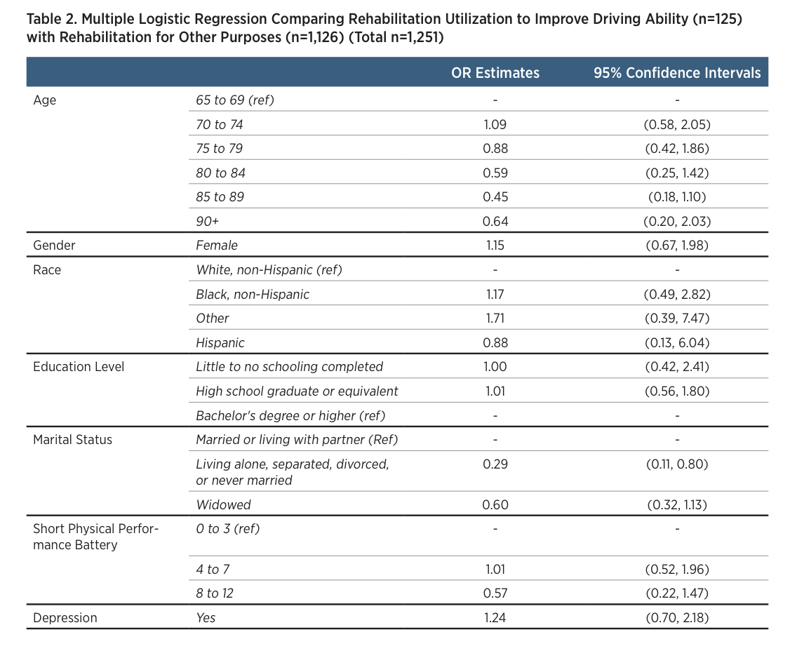 Table 2 shows the results of the weighted multiple logistic regression, modelling utilization of rehabilitation to improve driving ability over other reasons for rehabilitation with demographic characteristics, health characteristics, and physical function. Dementia/ Alzheimer’s and comorbidity count did not contribute significantly to the model and were dropped. After controlling for other factors, older adults who were single, separated, or never married were less likely to use rehabilitation for improving driving ability, compared to older adults who were married (OR: 0.29; 95% CI: 0.11 – 0.80). Although a significant association was not established, older adults who were widowed were less likely to use rehabilitation services to improve driving ability compared with older adults who were married (OR: 0.60; 95% CI: 0.32-1.13). In addition, trends show that participants who had better lower extremity physical functioning (measured by the Short Physical Performance Battery) were less likely to report utilizing rehabilitation services to improve driving ability